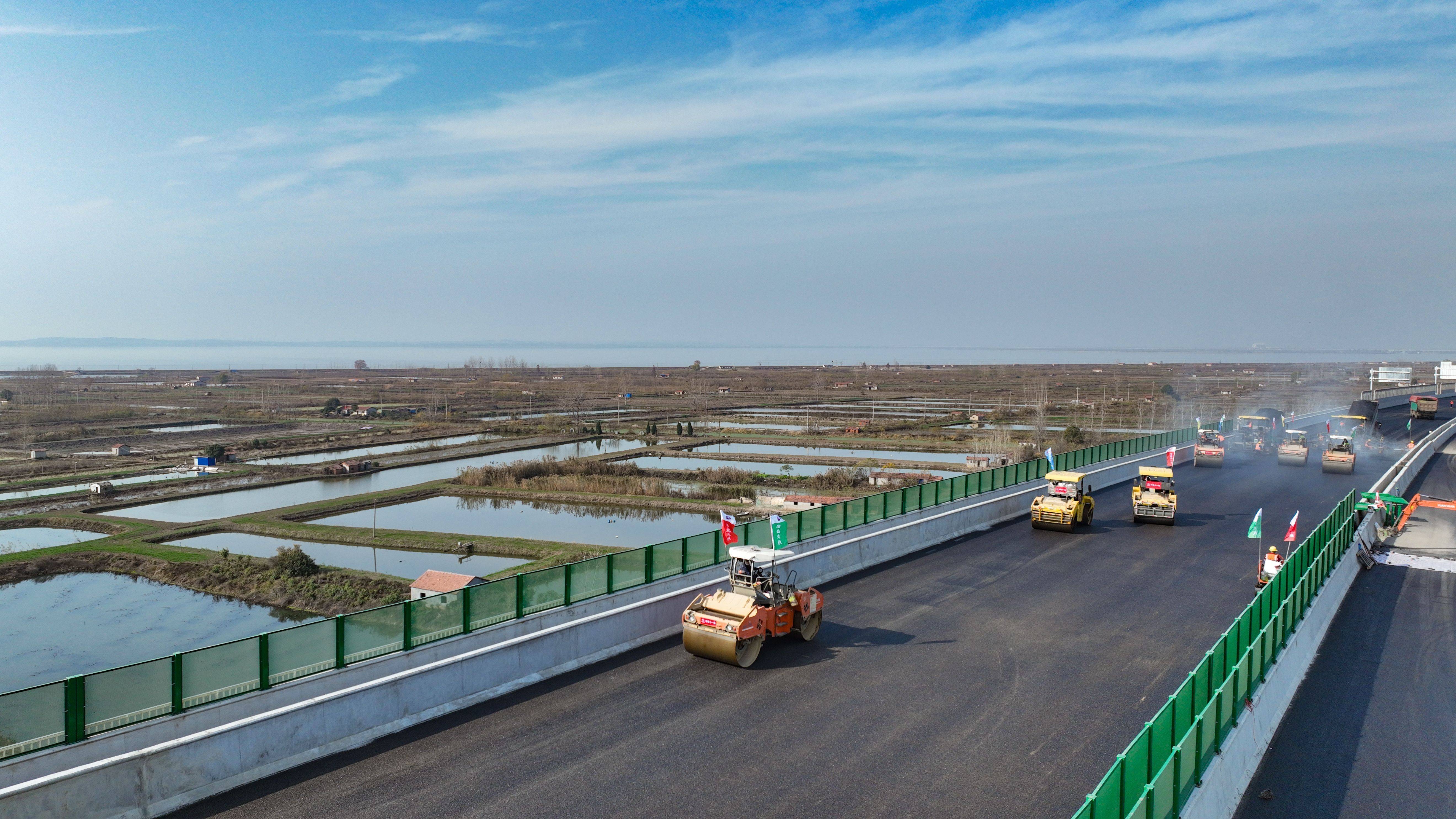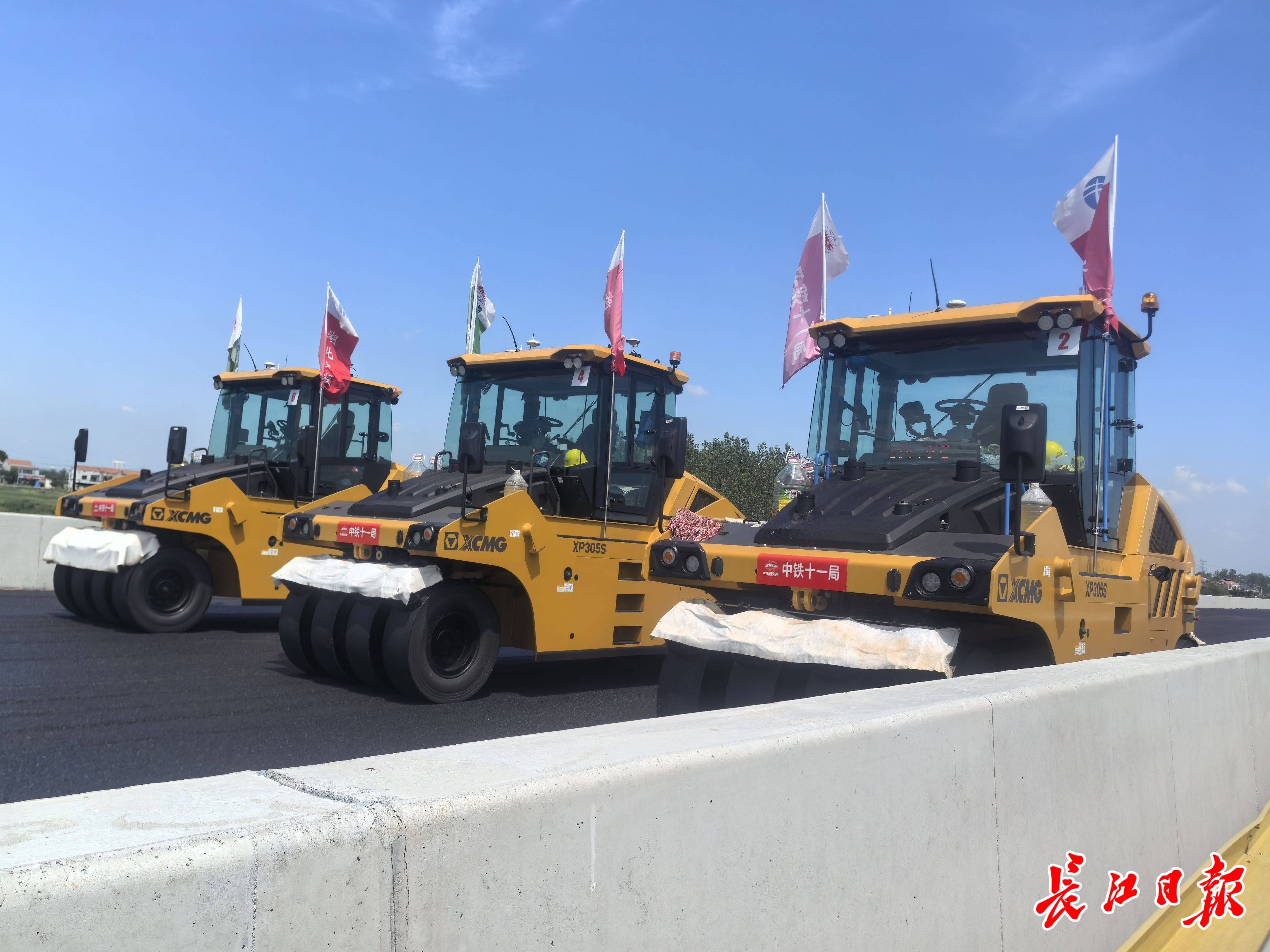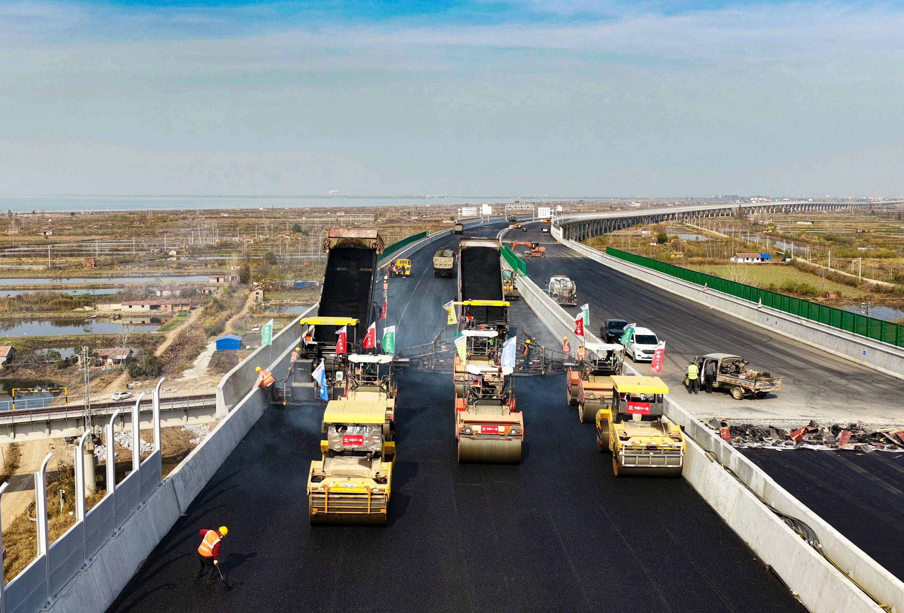 12月16日,长江日报记者来到由湖北交投投资建设、中铁十一局参与施工的新港高速公路(双柳长江大桥及其连接线工程)施工现场时看到,随着最后一车沥青混合料铺好、压平,武汉新港高速公路沥青摊铺施工结束,这标志着整个项目进入了通车前的最后冲刺阶段。