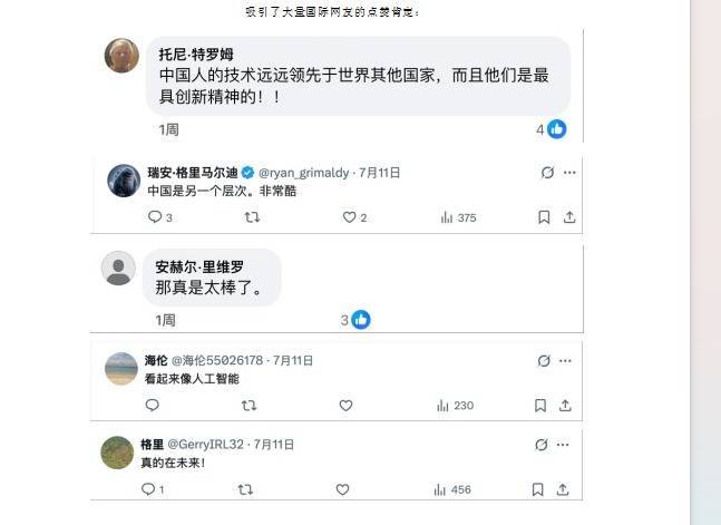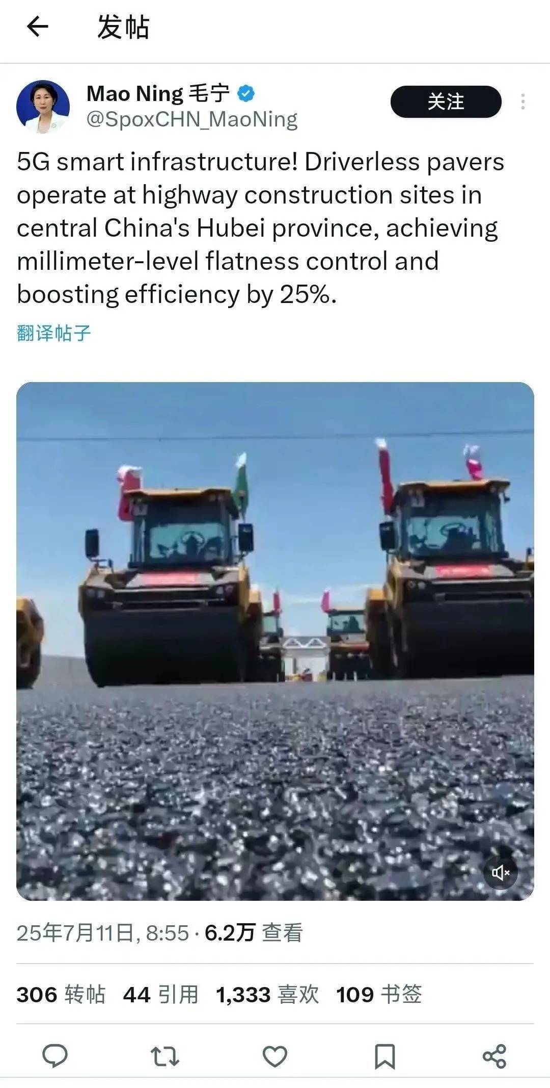 7月11日,外交部新闻司司长、发言人毛宁在社交平台上,发文并配图宣传:“5G智慧基础设施!在中国中部的湖北省,无人驾驶摊铺机在高速公路施工现场作业,实现毫米级平整度控制,效率提升25%。”她把武汉双柳长江大桥的无人驾驶摊铺技术作为中国高质量发展和科技进步的例证,积极向世界介绍。